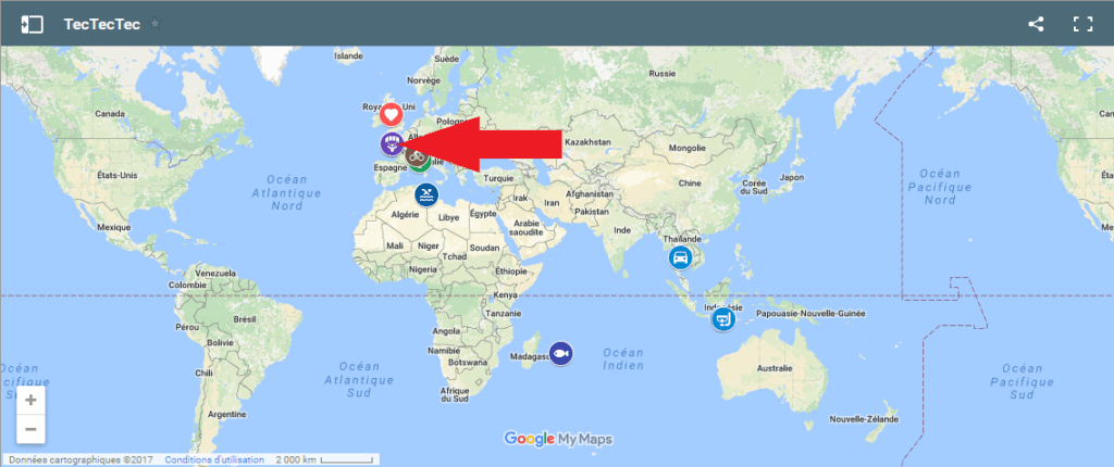 Sur la carte de la page d’accueil, vous pouvez voir des icones. Cliquez sur l’une d’elles pour voir la vidéo ou la photo.